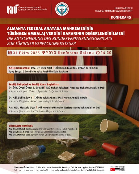 Die Konferenz, die mit der Eröffnungsrede der Prodekanin, Doz. Dr. Esra Yiğit, beginnen wird und sich auf die Bewertung der Entscheidung des Bundesverfassungsgerichts zur Tübinger Verpackungssteuer aus Sicht des Verfassungsrechts (Dr. Ögr. Üyesi Ömer E. Egeli), des Steuerrechts (Dr. Adil Selim Sayın) und des Umweltrechts (Arş. Gör. Mustafa Uçar) konzentrieren wird, findet am Freitag, den 31. Oktob…
