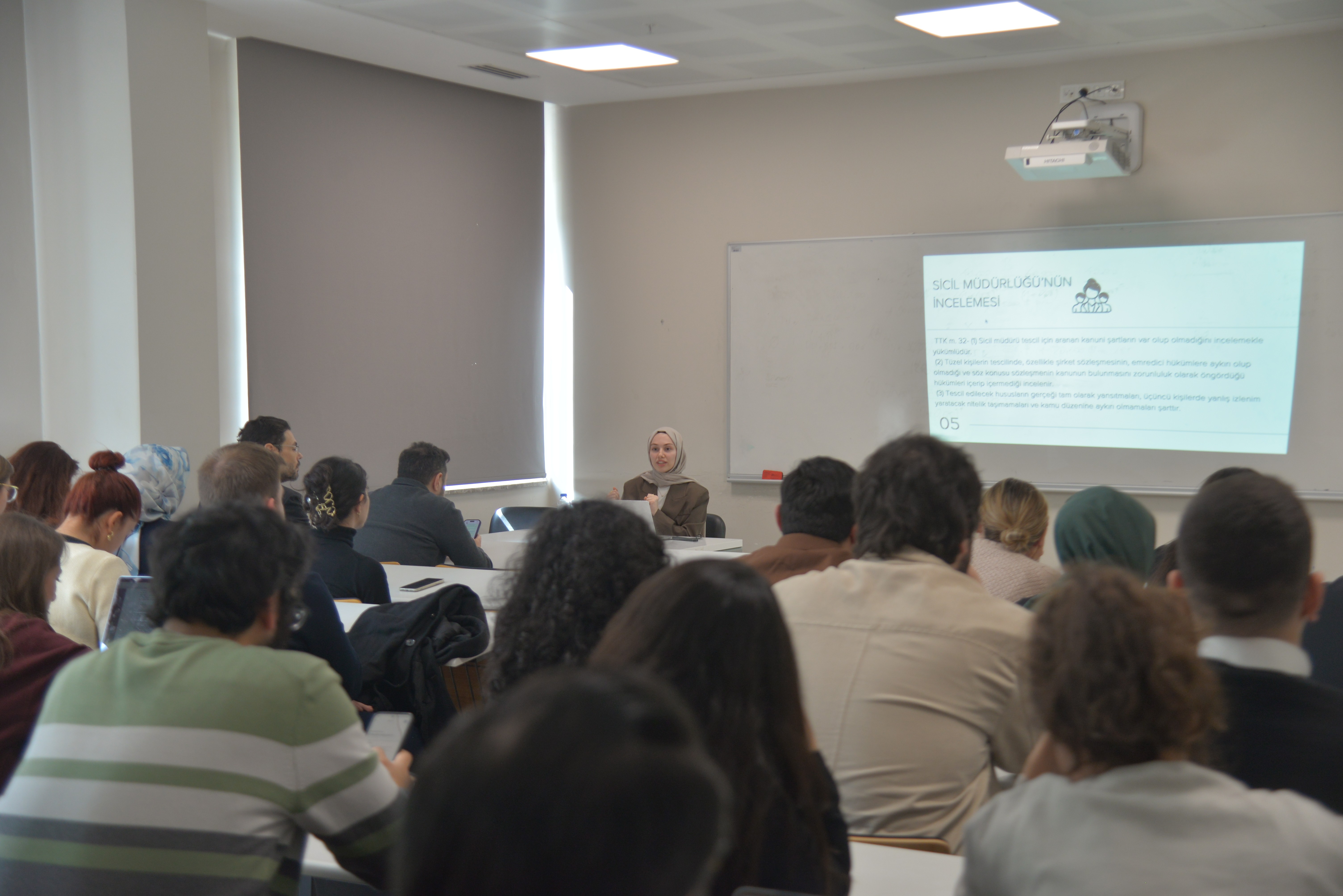 Özel Hukuk Bölümü / Ticaret Hukuku Ana Dalı araştırma görevlisi Arş. Gör. Gülnihal DÜNDAR, “Ticaret Siciline Tescil” konulu sunumunu yapmıştır.
