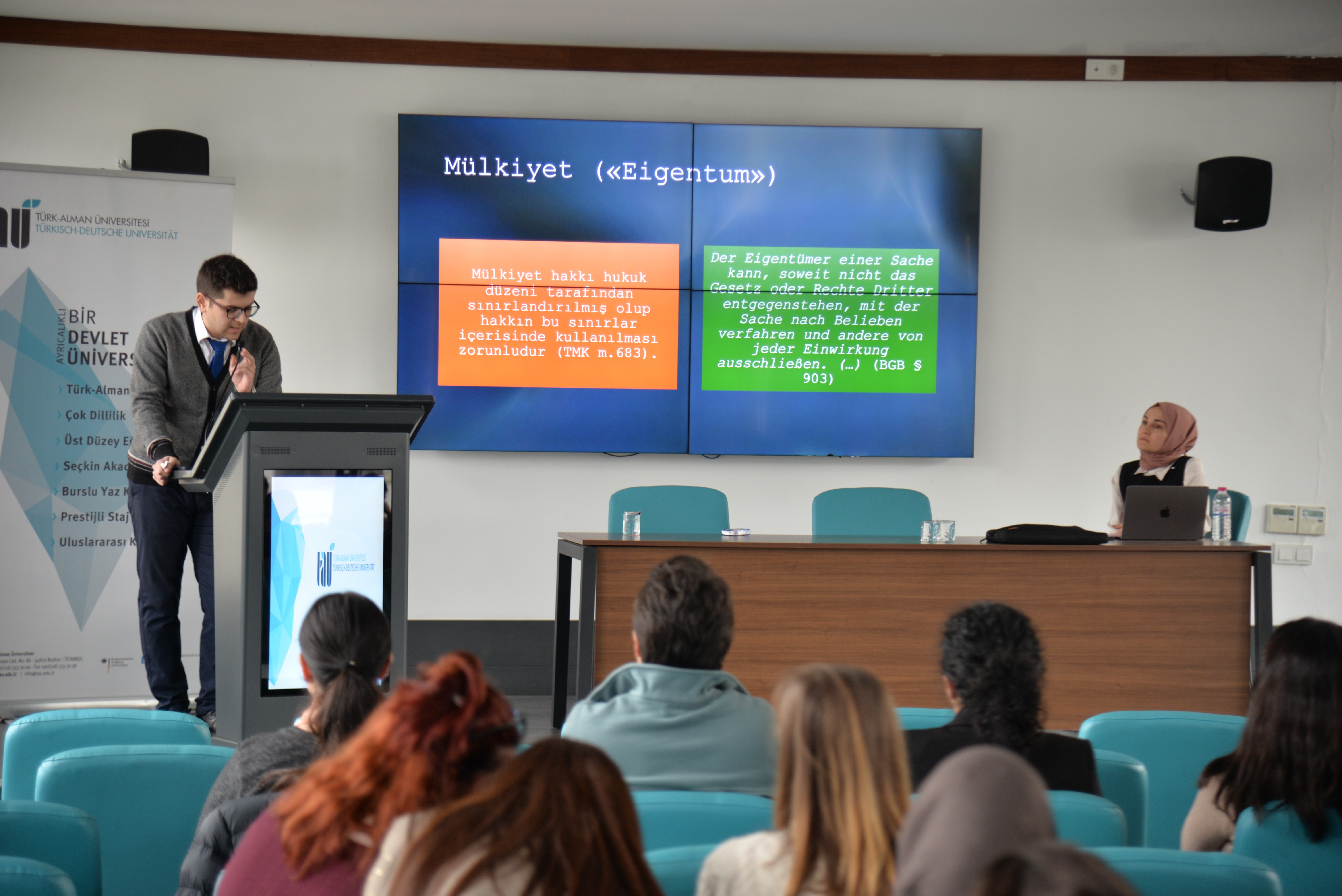 Der wissenschaftliche Mitarbeiter der Abteilung für Privatrecht / Abteilung für Zivilrecht, Samet ŞAHİN hielt einen Vortrag zum Thema „Verfügung über den Anteil am Miteigentum“.