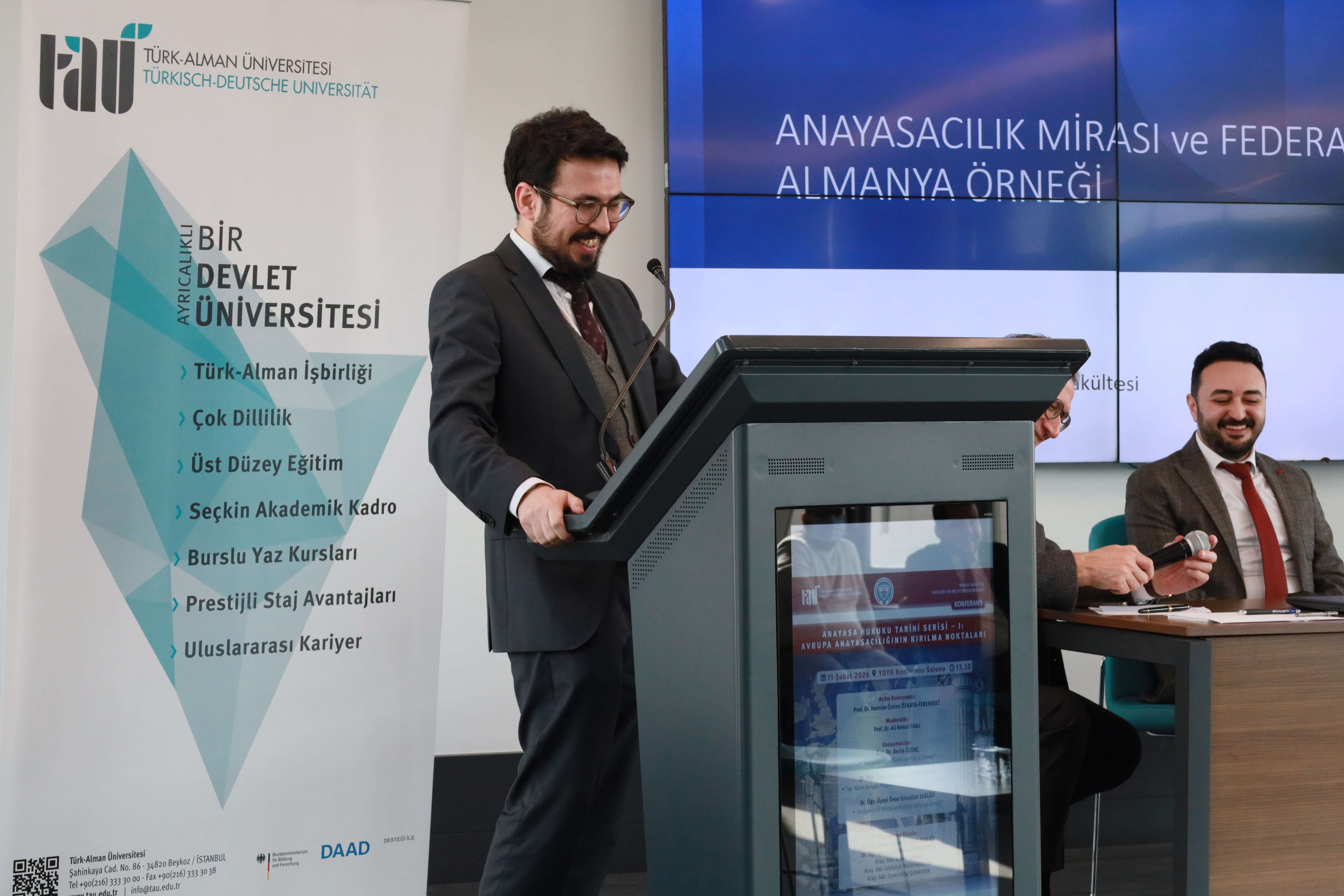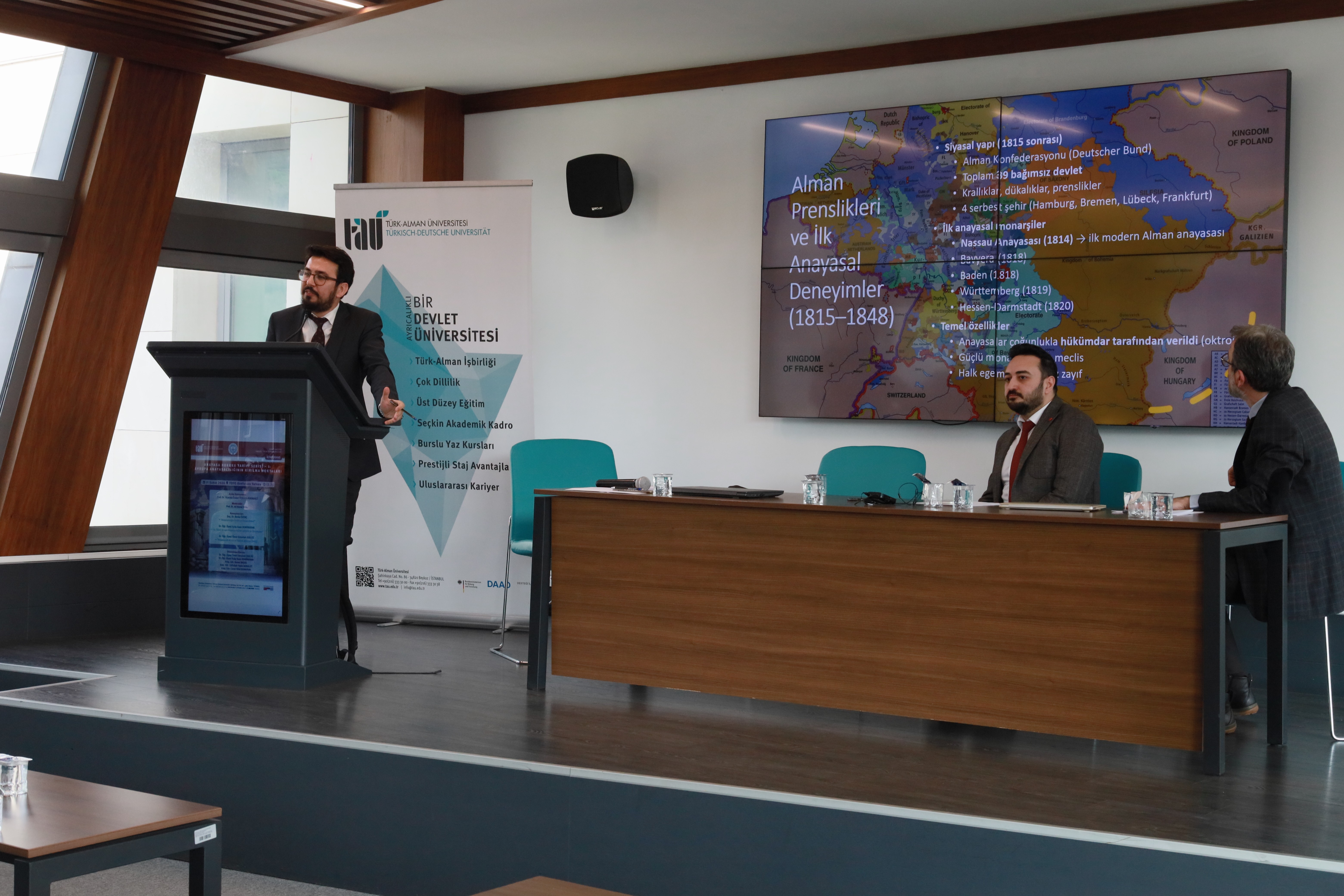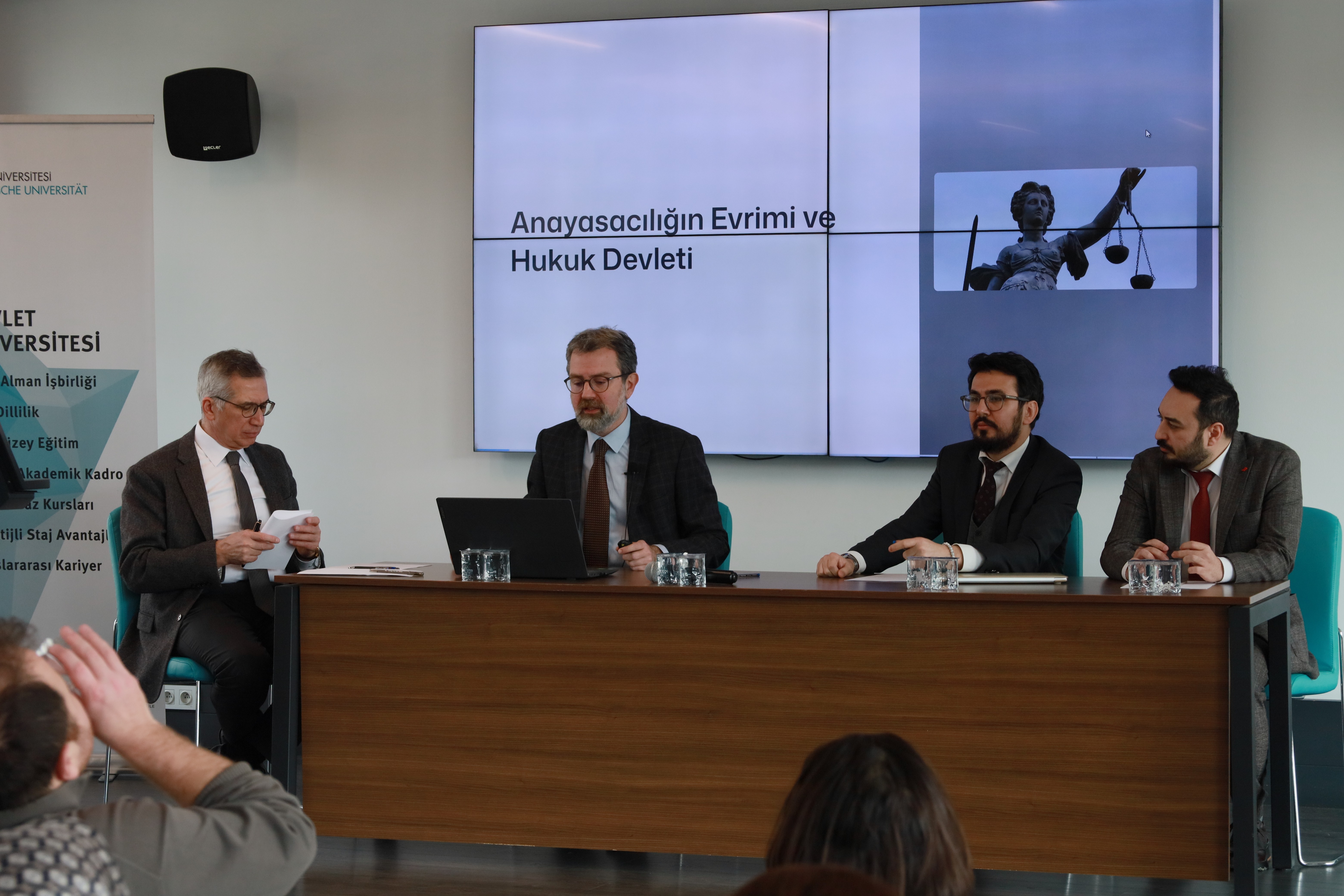 Unter der Moderation von Prof. Dr. Ali Kemal Yıldız behandelte PD Dr. Berke Özenç in seinem Vortrag mit dem Titel „Die Entwicklung des Konstitutionalismus und der Rechtsstaat“ die historische Entfaltung des Konstitutionalismus sowie den Institutionalisierungsprozess des Rechtsstaatsgedankens. Dr. Eyüp Kaan Demirkıran analysierte in seinem Beitrag „Die Entwicklung und Auswirkungen des europäischen Konstitutionalismus im 19. Jahrhundert“ die politischen und institutionellen Effekte der konstitutionellen Bewegungen des 19. Jahrhunderts. Dr. Ömer Emrullah Egeliği untersuchte in seinem Vortrag „Das Erbe des Konstitutionalismus und das Beispiel der Bundesrepublik Deutschland“ die Reflexionen des konstitutionellen Erbes im gegenwärtigen Verfassungsgefüge am Beispiel Deutschlands.