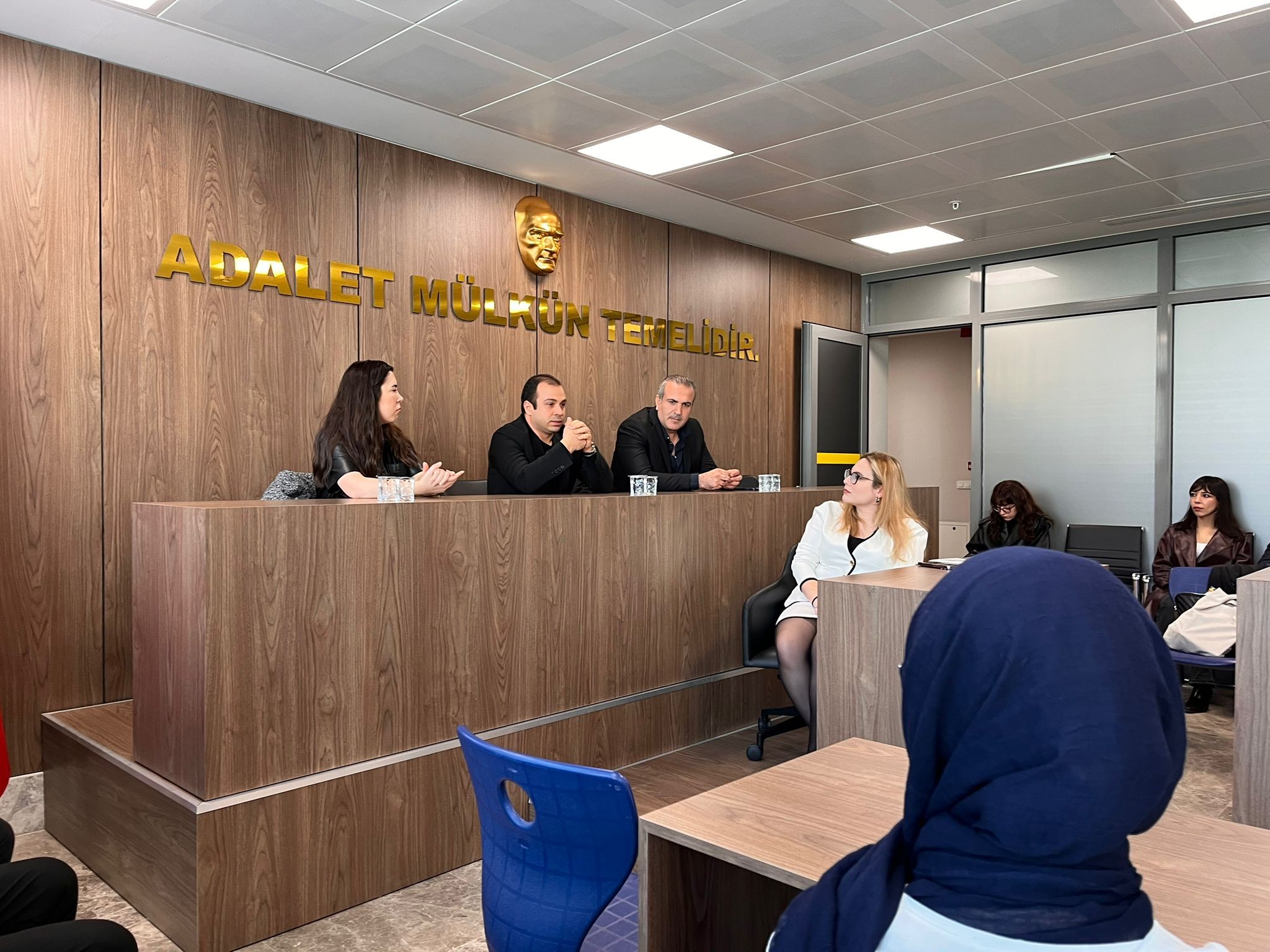 Yazı İşleri Müdürü Burhan Maden, Zabıt Kâtibi Beyzanur Çetin ve Mübaşir Hüseyin Cenk, Yargı Görevlileri ve Hukukî İletişim Dersinde Hukuk Öğrencileriyle Meslekî Deneyimlerini Paylaştı